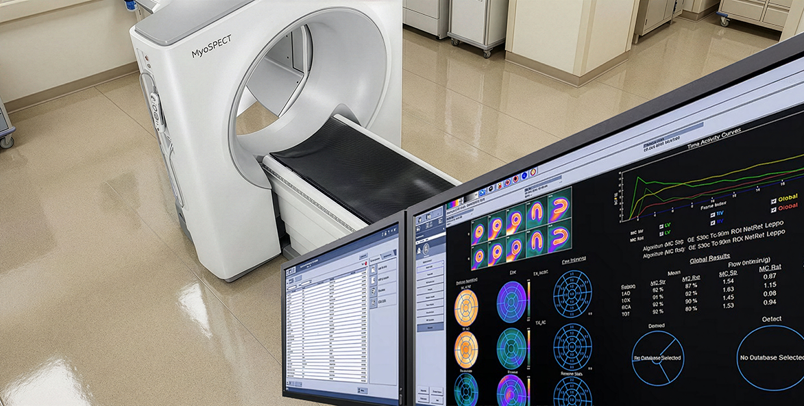 MyoSPECT™ es un sistema SPECT de GE HealthCare exclusivamente diseñado para cardiología, equipado con detectores CZT fijos y geometría multi-pinhole que permiten obtener imágenes de alta resolución en tiempos reducidos, con menor tasa de artefactos y mayor confort para el paciente. Las adquisiciones se procesan en la estación Xeleris, que integra algoritmos avanzados de reconstrucción, corrección de movimiento (MotionFree™) y herramientas específicas para análisis de perfusión, función ventricular y estudios gatillados (Gated SPECT).